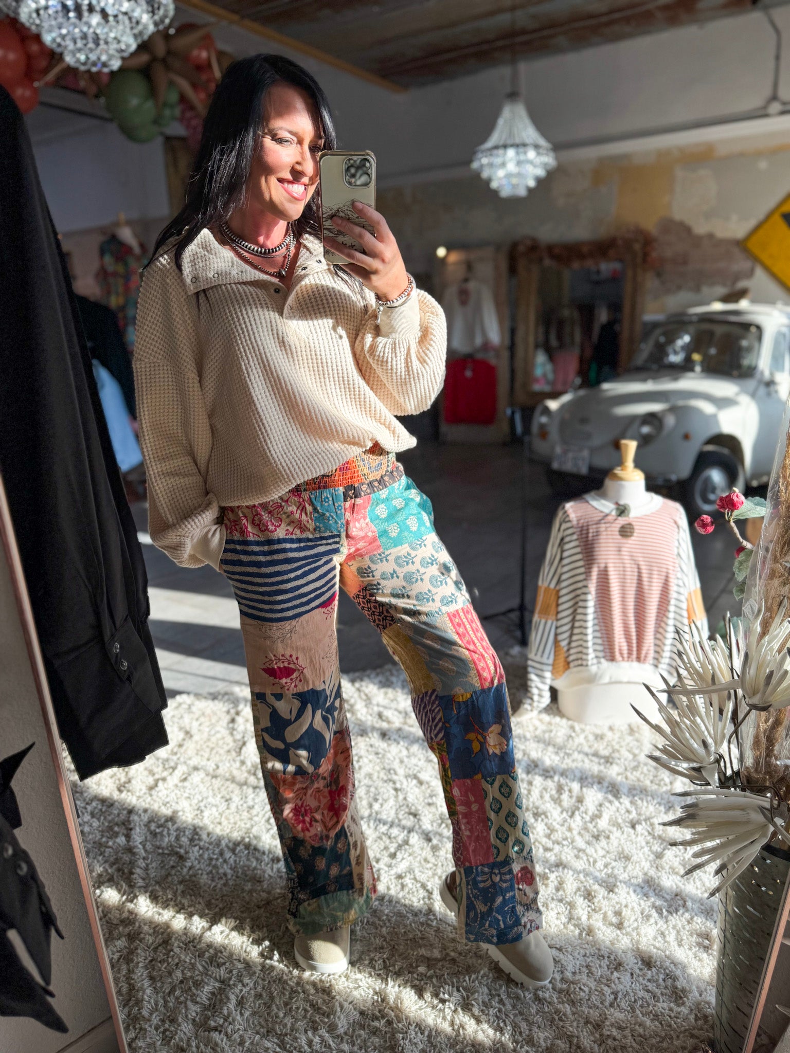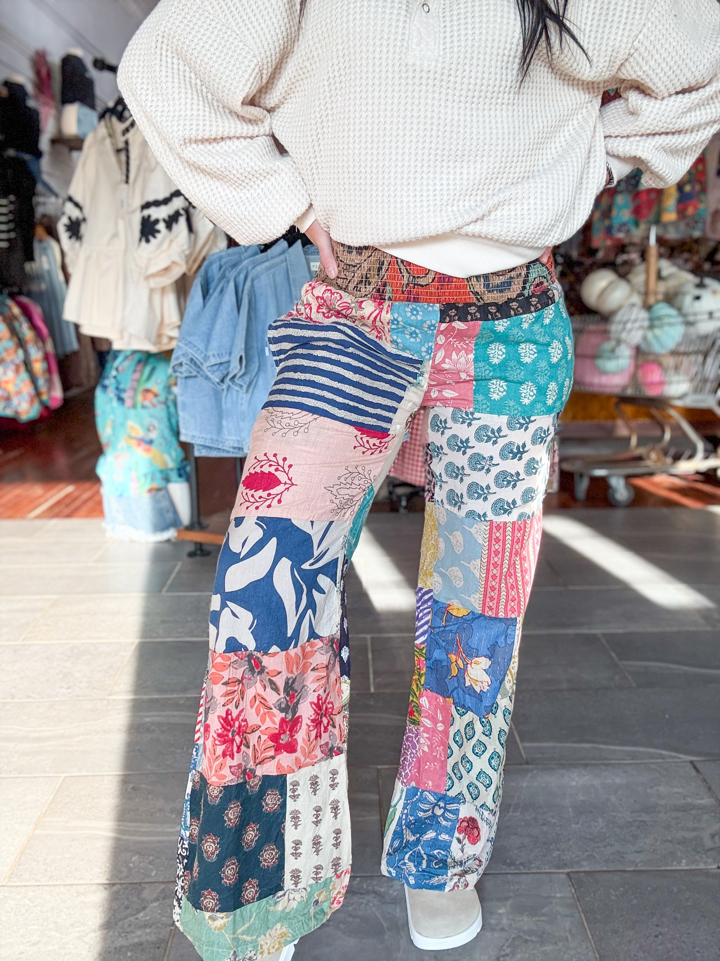 - Bright patchwork pants