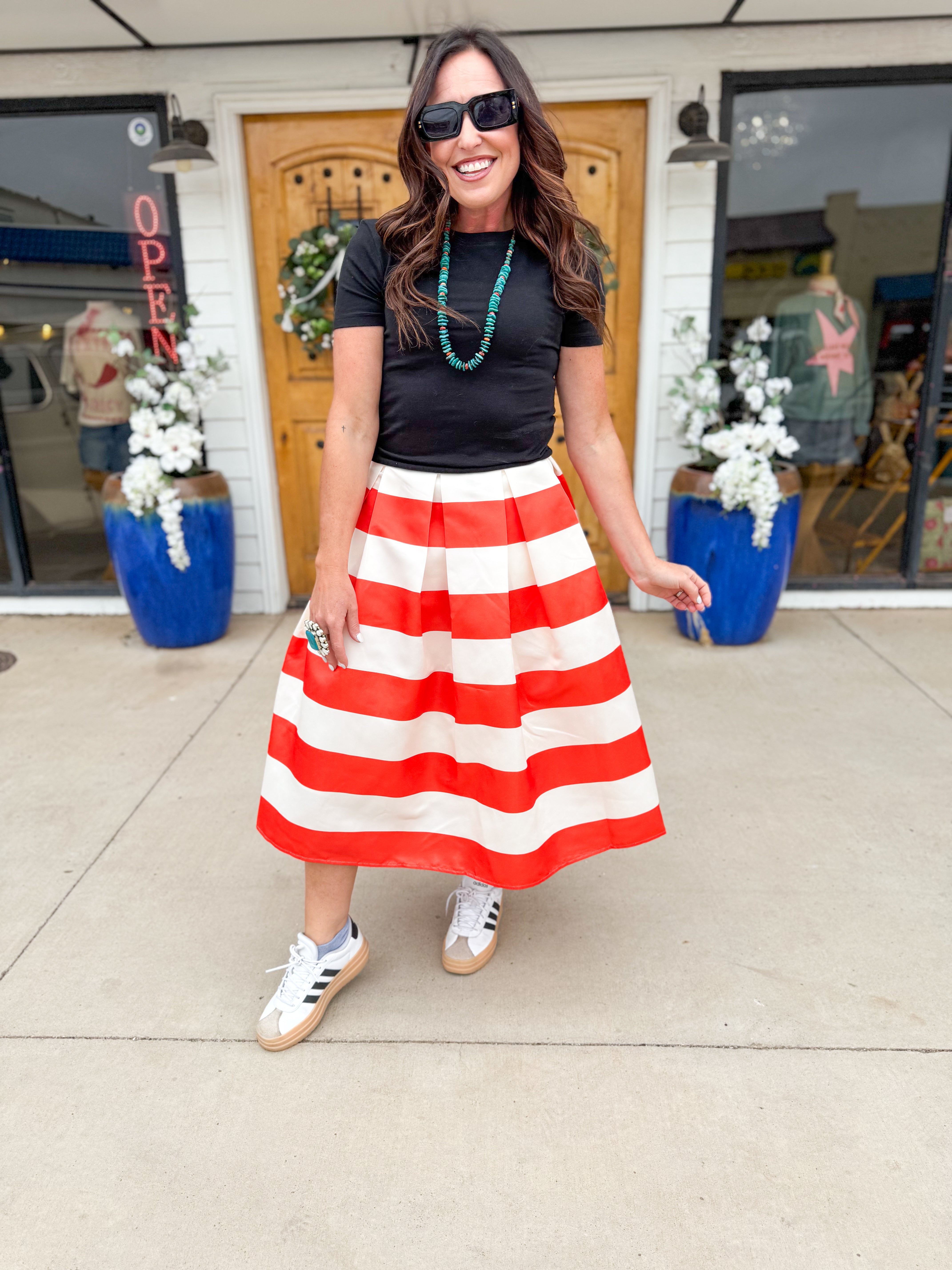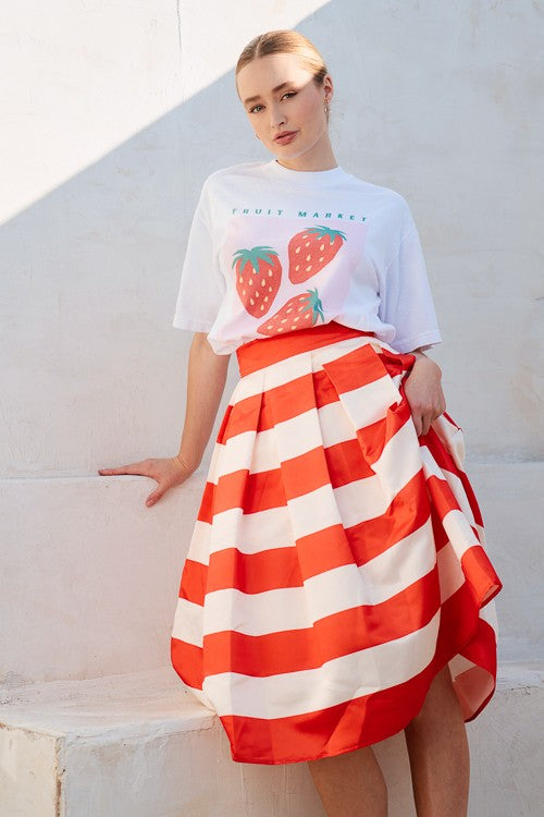 • Cream and orange striped midi skirt