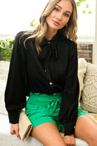 - Long sleeve collared top with removable bow and pearl buttons