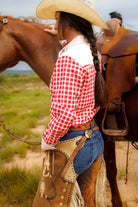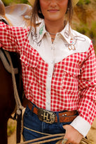 - Long sleeve red gingham pearl snap with cowboy embroidery