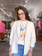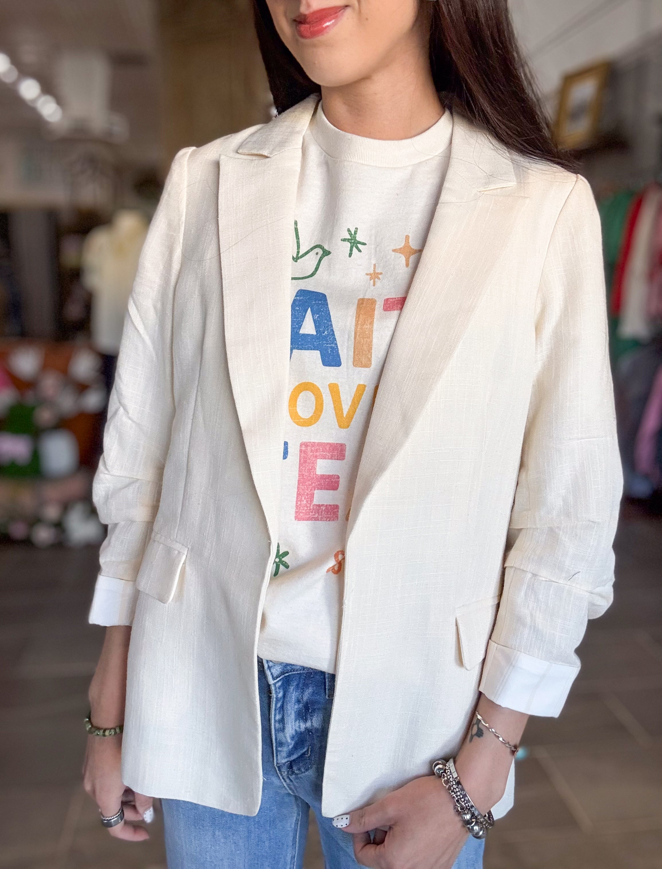 - Cinched sleeve cream blazer